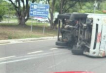 Segundo informações preliminares, o veículo tentou subir uma ladeira, colidiu com um poste e acabou tombando na via.