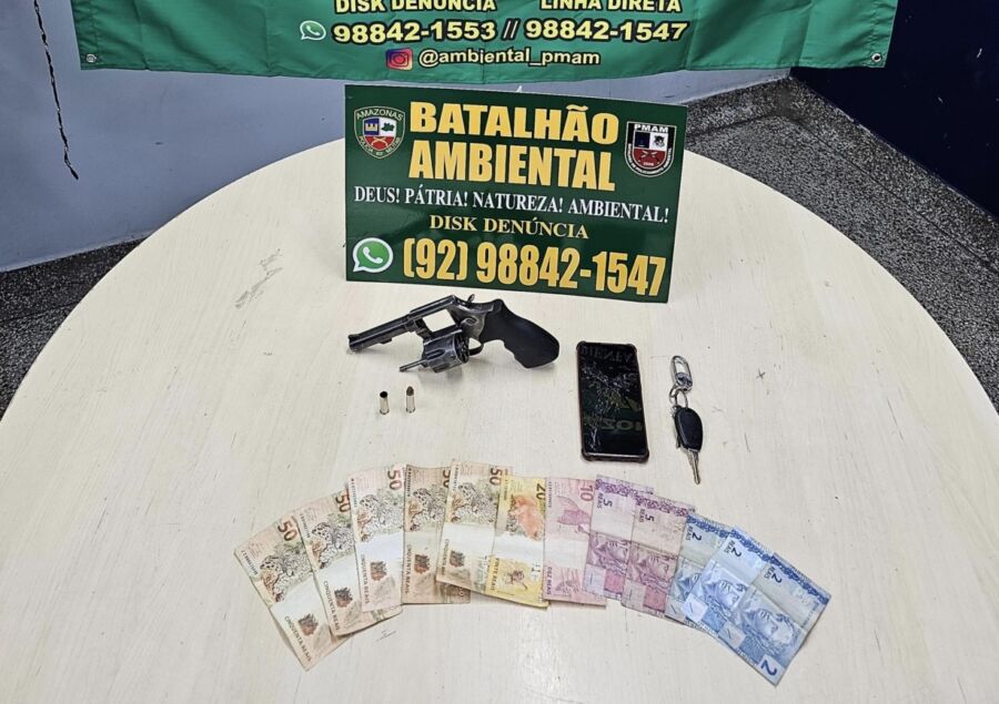 Os policiais militares seguiram a dupla. Um deles conseguiu escapar e o outro foi preso em flagrante com a arma do crime, um revólver Taurus, calibre 38, com uma munição intacta e uma deflagrada; R$296,00 reais em espécie e um aparelho celular.