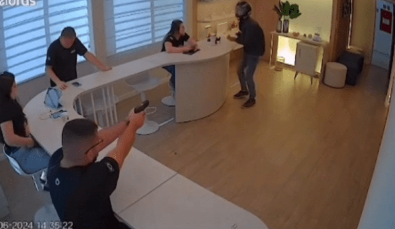O caso aconteceu na quinta-feira (13) em uma loja de celulares na Rua Pereira Passos, no bairro Uvaranas, em Ponta Grossa. Nas imagens é possível ver que uma vítima saca uma arma particular de calibre 9mm e dispara seis vezes contra o invasor. Os tiros atingiram a cabeça, tórax, abdômen e os braços do meliante.