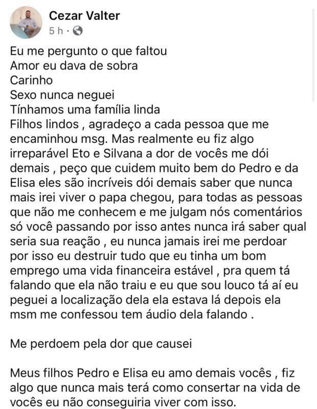 Antes do acidente, Cezar fez uma postagem nas redes sociais, onde afirmou ter feito algo “irreparável” e que Jaine havia confessado a traição. A polícia investiga o caso. O corpo de Luiz Cezar foi removido pelo Instituto Médico Legal (IML).