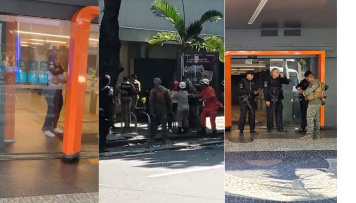 Imagens mostram o momento em que os PMs entram na agência. É possível ouvir o negociador da corporação gritando “não”, enquanto outros agentes correm em direção ao bandido. São disparados cinco tiros e, cerca de dez segundos depois, a vítima sai do estabelecimento amparada por militares.