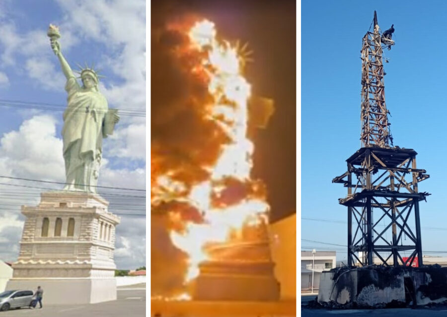 Uma estátua da rede de lojas Havan, localizada na Avenida Honorato Viana, em Petrolina, no Sertão de Pernambuco, foi incendiada na madrugada desta terça-feira (23). A Polícia Civil abriu um inquérito para investigar os crimes de dano e incêndio dolosos.
