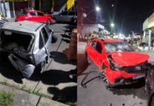 Carro destrói poste em acidente na Avenida do Turismo na Ponta Negra em Manaus