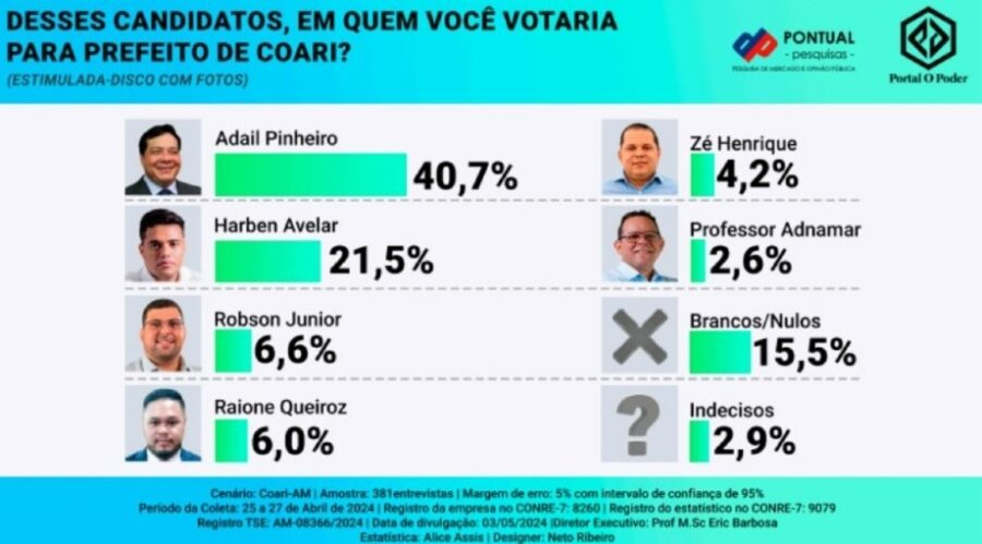 Nas pesquisas, o ex-prefeito surge com um percentual de 40,7% nas intenções de votos, e pode ser eleito no pleito que será realizado em outubro. Mesmo com a ficha suja e todo o seu histórico de condenações, o ex-parlamentar ainda é visto como uma boa opção para os moradores de Coari.