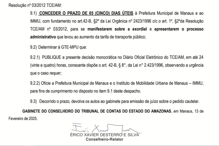 A Prefeitura de Manaus assim como o Instituto Municipal de Mobilidade Urbana (IMMU) têm um prazo de cinco dias úteis para encaminhar ao tribunal os documentos que embasaram o reajuste tarifário.