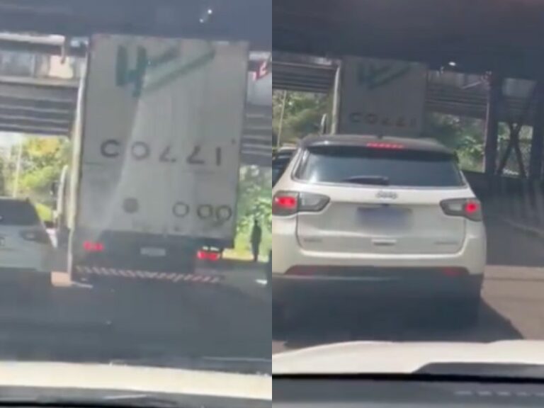 E uma foto é possível ver que a cabine passou pelas duas pontes da avenida Constantino Nery, mas o compartimento da carreta colidiu com a estrutura, impedindo que completasse a manobra.