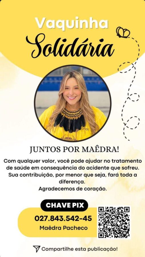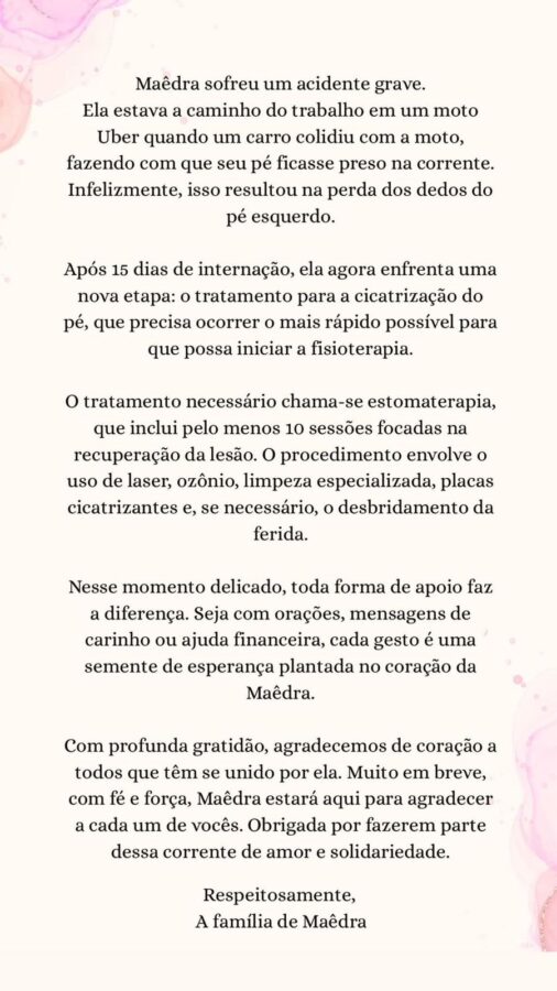 A família faz um apelo por apoio neste momento delicado. Qualquer ajuda é bem-vinda. Cada gesto de solidariedade representa uma nova esperança para Maêdra em sua jornada de reabilitação.