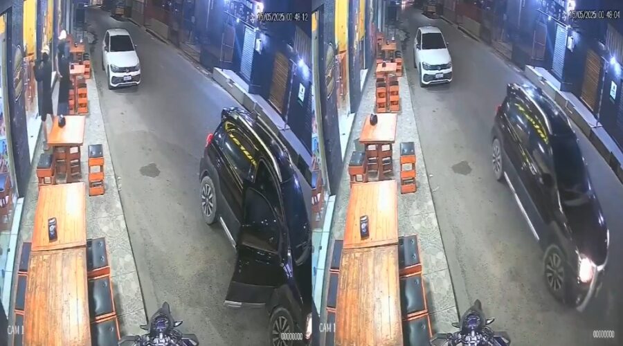 Os criminosos tentaram forçar a entrada, exigindo que alguém abrisse o local. No entanto, após alguns segundos de tentativa frustrada, desistiram e retornaram rapidamente ao carro, fugindo do local sem consumar o crime.