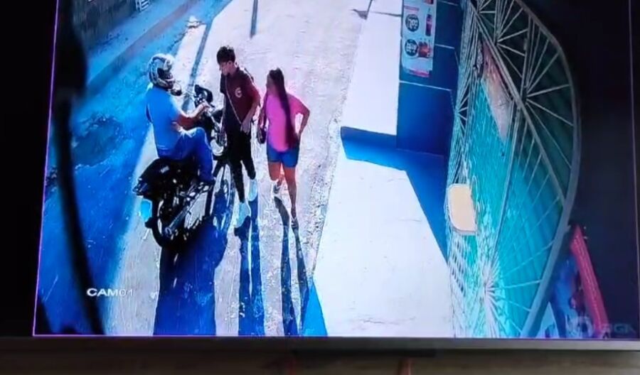 Nas imagens, é possível ver um motociclista sozinho, abordando um estudante. Confira: