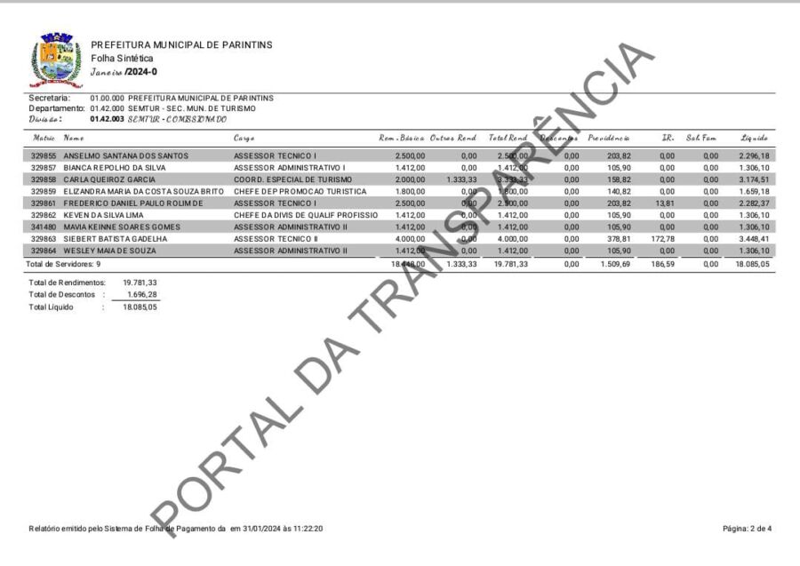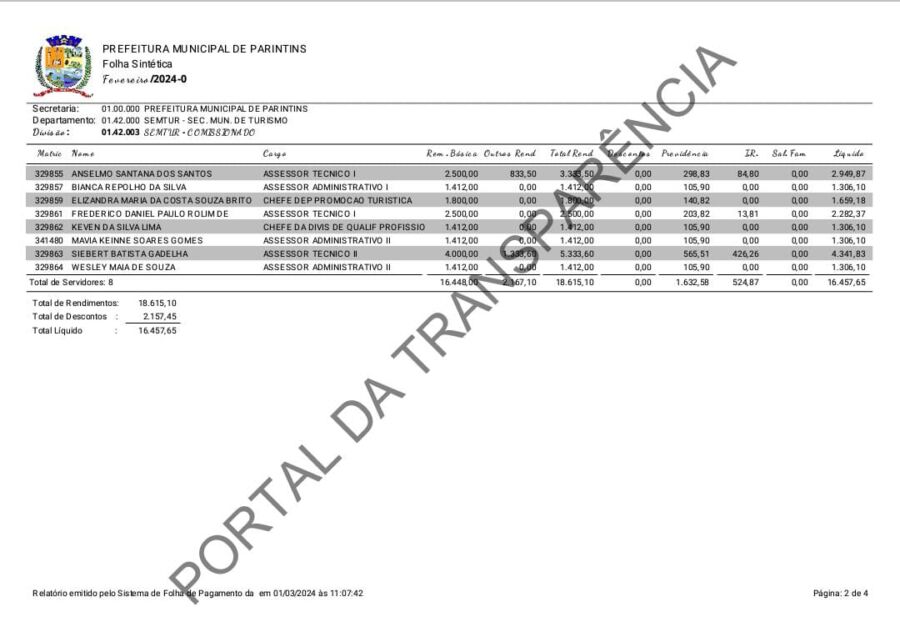 Ainda sobre o assunto e conforme o Portal da Transparência, Frederico Daniel Paulo recebe remuneração líquida de R$ 2.282,37, salário que somado no ano chega a R$ 27.388,44 sem comparecer à secretaria regularmente. O cargo seria uma forma de compensá-lo pelo apoio prestado a Bi García no período em que era candidato à Prefeitura Municipal.