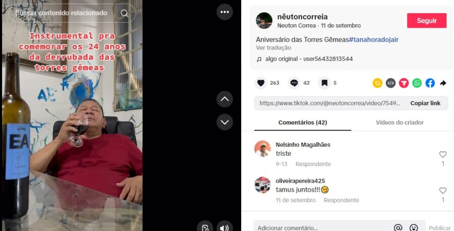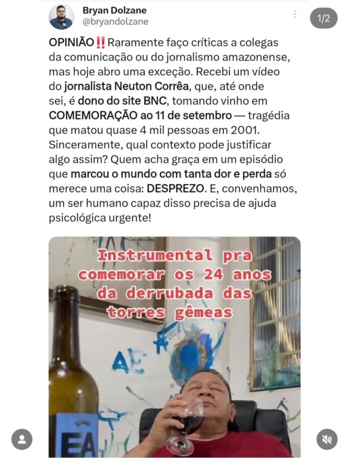 O ex-vereador de Manaus Chico Preto classificou como ‘desvio de caráter’ a publicação do jornalista amazonense Neuton Corrêa, na qual ele “comemora” os ataques terroristas do 11 de setembro no perfil do TikTok com uma taça de vinho na mão ao som instrumental da música ‘Tá Na Hora do Jair Já Ir Embora’, acompanhado da legenda: “Para comemorar os 24 anos da derrubada das torres gêmeas”. A publicação foi feita no último dia 11, e viralizou na internet.