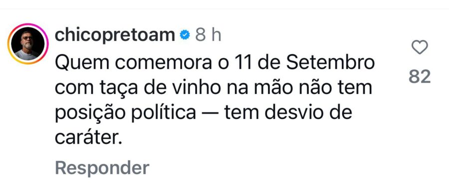 Chico Preto comentou na postagem do jornalista Bryan Dolzane, que foi um dos primeiros a se pronunciar sobre o assunto. “Quem comemora o 11 de Setembro com taça de vinho na mão não tem posição política, tem desvio de caráter”, declarou o ex-vereador sobre a tragédia que matou mais de 3 mil pessoas nos Estados Unidos (EUA).