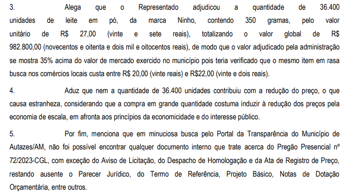 De acordo com informações divulgadas pelo Diário Oficial do TCE-AM, a Prefeitura de Autazes adquiriu, através da Secretaria Municipal de Assistência Social (Semas), um total de 36.499 mil unidades de leite em pó da marca Ninho, com 350 gramas cada, ao preço unitário de R$ 27,00. Isso resultou num montante global de R$ 982.800,00. No entanto, a análise realizada pelo TCE-AM indicou que esse valor está cerca de 35% acima do praticado no mercado local.